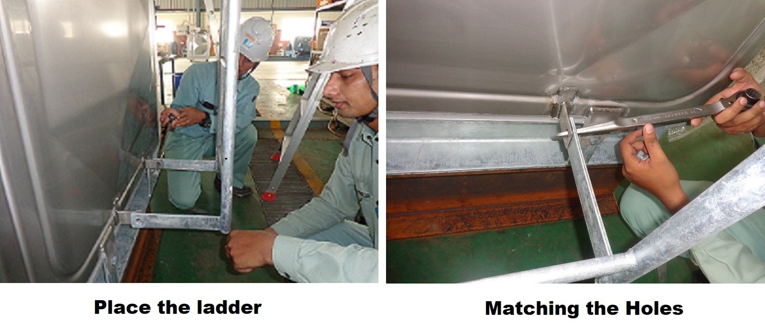 - After Installation of the tank in position, place the Ladder parallel to the tank near the ladder fixing strips on the tank.